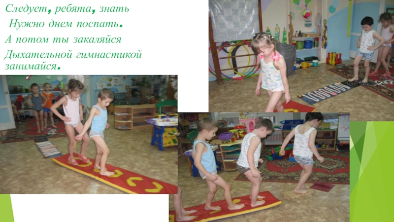Следует, ребята, знать Нужно днем поспать.А потом ты закаляйсяДыхательной гимнастикой занимайся.