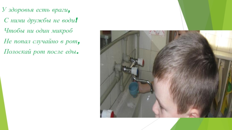 У здоровья есть враги, С ними дружбы не води! Чтобы ни один микроб Не попал случайно в рот, Полоскай рот после