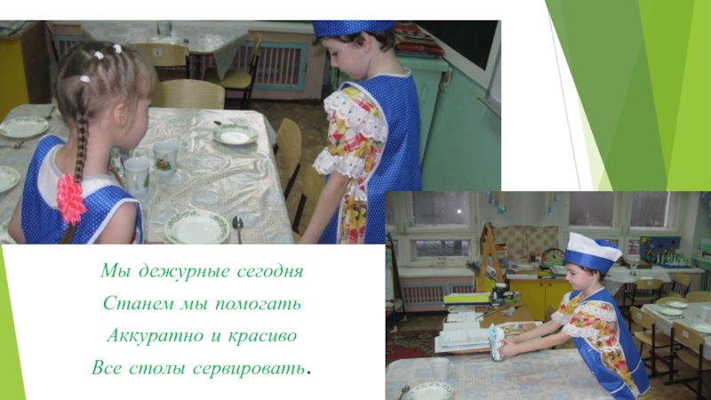 Мы дежурные сегодняСтанем мы помогатьАккуратно и красивоВсе столы сервировать.