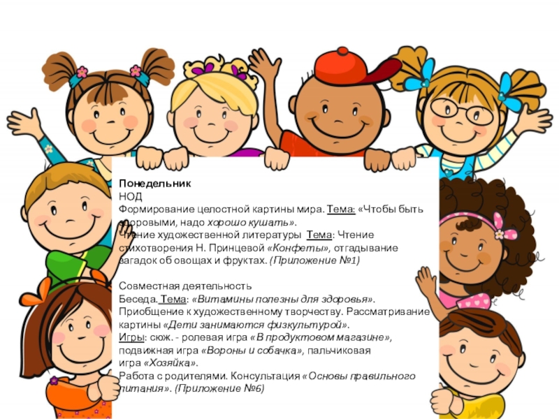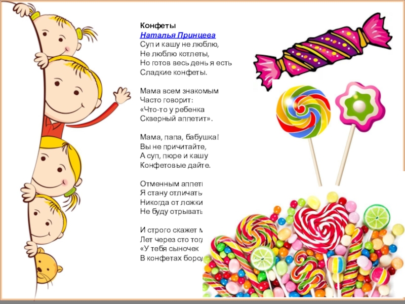 художественной литературы Тема: Чтение стихотворения Н. Принцевой «Конфеты», отгадывание загадок об овощах и фруктах. (Приложение №1)