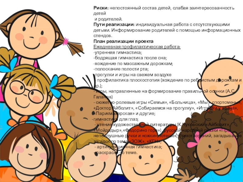 Слайд 9Риски: непостоянный состав детей, слабая заинтересованность детей