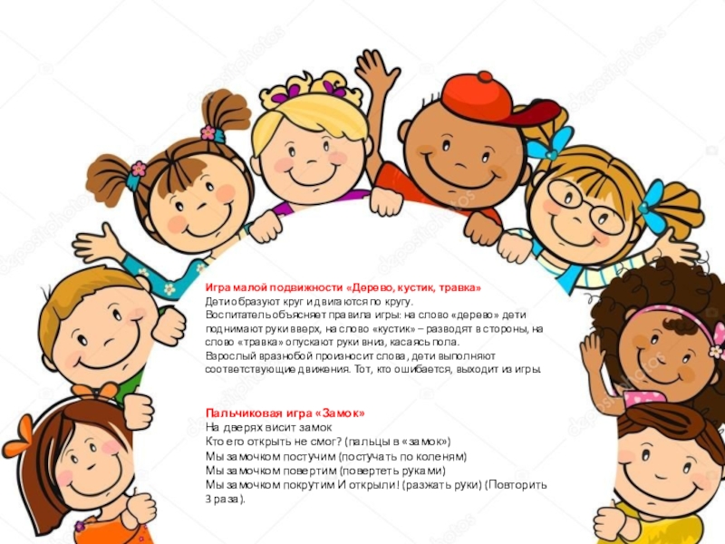 игра «Запомни движение», игра малой подвижности «Дерево, куст, трава», пальчиковая игра «Замок».