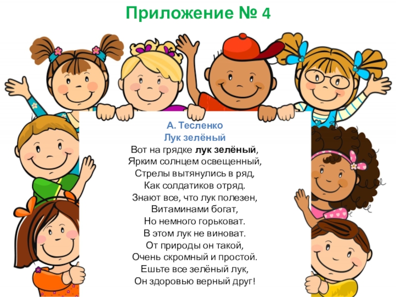 Чтение художественной литературы. Тема: Чтение стихотворения А. Тесленко «Вот на грядке лук зеленый…» (Приложение №4)