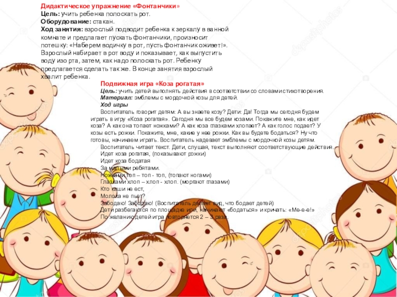 Игры: сюж. - ролевая игра «В магазин за овощами», дид. упражнение «Фонтанчики», подвижная игра «Коза рогатая», пальчиковая игра «Дождик».