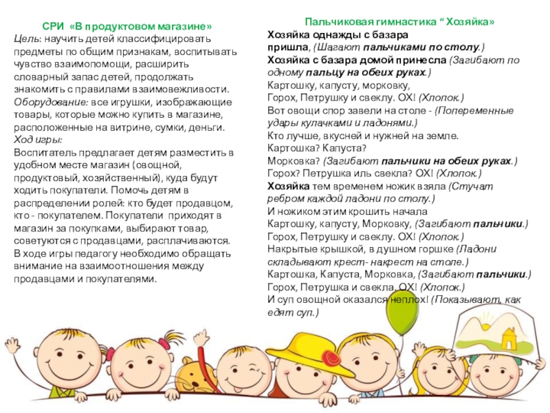 Игры: сюж. - ролевая игра «В продуктовом магазине», подвижная игра «Вороны и собачка», пальчиковая игра «Хозяйка».