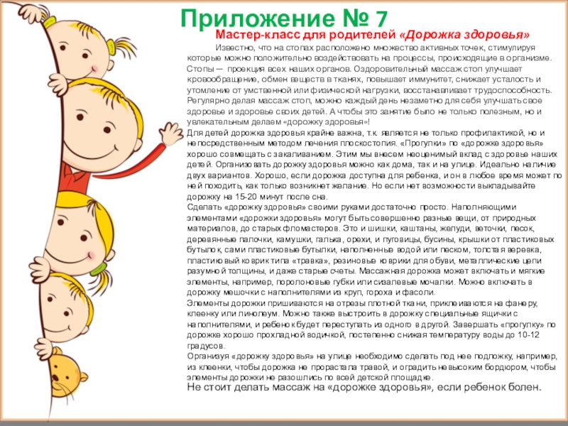 которые можно положительно воздействовать на процессы, происходящие в организме. Стопы — проекция всех наших органов. Оздоровительный массаж стоп улучшает кровообращение, обмен веществ в тканях, повышает иммунитет, снижает усталость и утомление от умственной или физической нагрузки, восстанавливает трудоспособность. Регулярно делая массаж стоп, можно каждый день незаметно для себя улучшать свое здоровье и здоровье своих детей. А чтобы это занятие было не только полезным, но и увлекательным делаем «дорожку здоровья»!