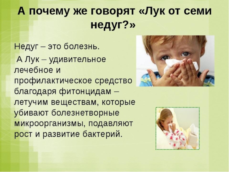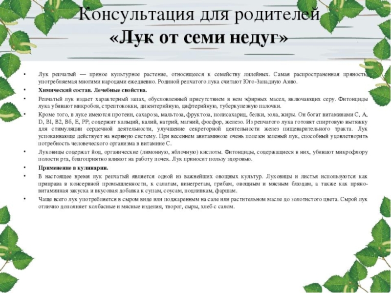 Работа с родителями. Консультация «Лук от семи недуг».(Приложение №9)