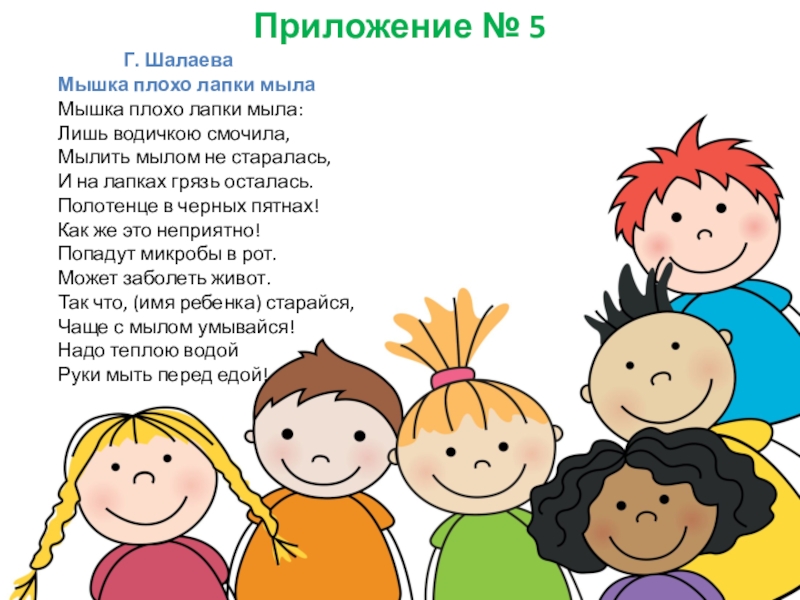 Чтение художественной литературы. Тема: Чтение стихотворения Г. Шалаевой «Мышка плохо лапки мыла», отгадывание загадок о здоровом образе жизни. (Приложение №5)