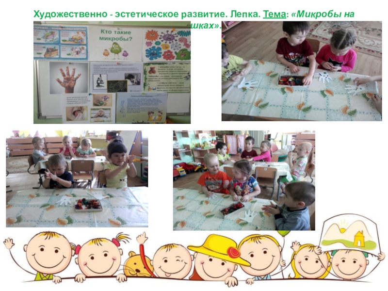 Слайд 58Художественно - эстетическое развитие. Лепка. Тема: «Микробы на ладошках».