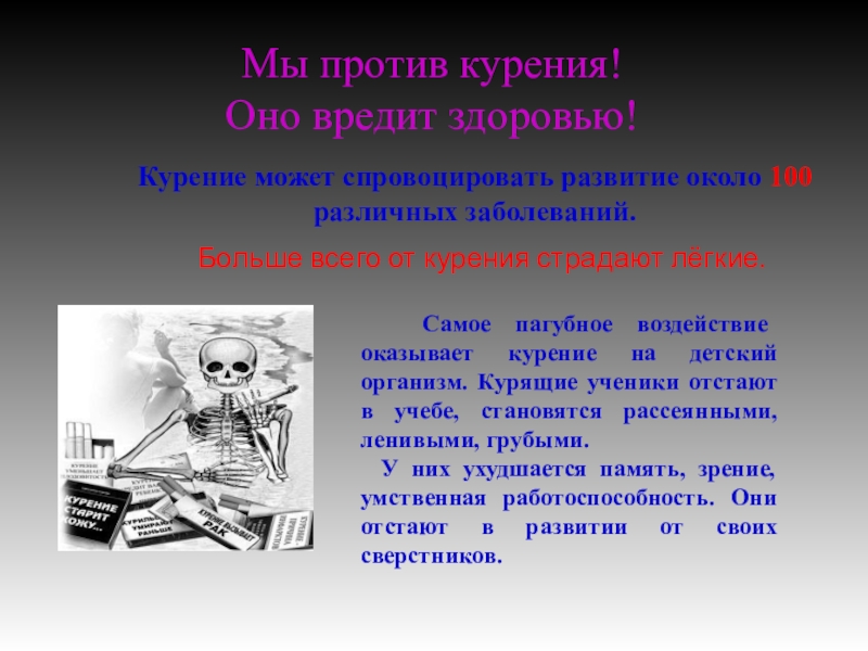 Самое пагубное воздействие оказывает курение на детский организм. Курящие ученики отстают в учебе, становятся рассеянными, ленивыми, грубыми.