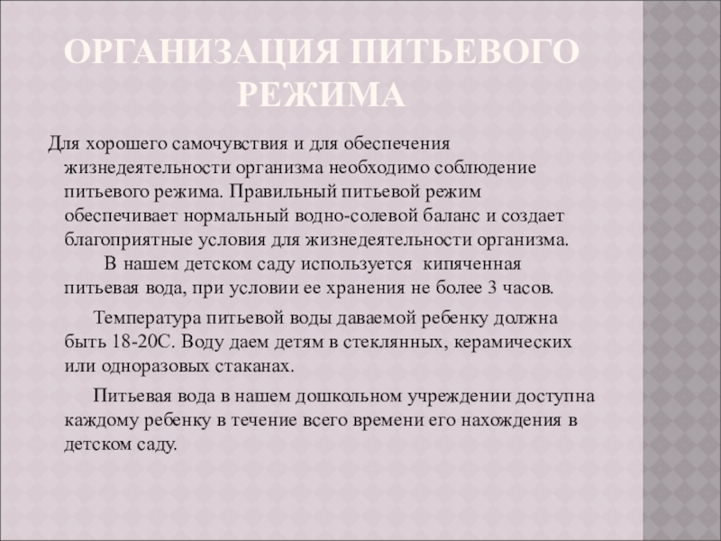 питьевого режима. Правильный питьевой режим обеспечивает нормальный водно-солевой баланс и создает благоприятные условия для жизнедеятельности организма.
