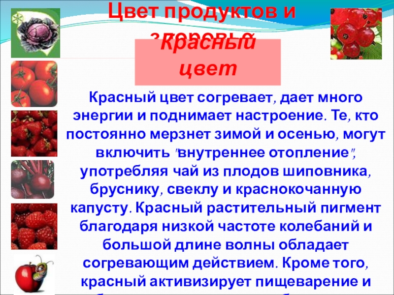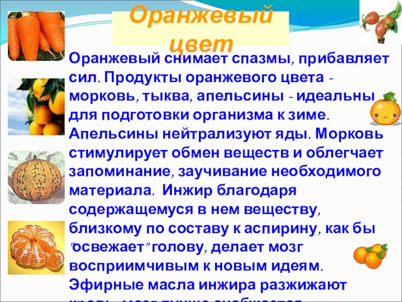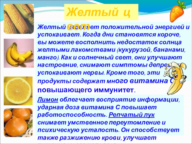 Желтый наделяет положительной энергией и успокаивает. Когда дни становятся короче, вы можете восполнить недостаток солнца желтыми лакомствами (кукурузой, бананами, манго). Как и солнечный свет, они улучшают настроение, снимают симптомы депрессии, успокаивают нервы. Кроме того, эти продукты содержат много витамина С, повышающего иммунитет.