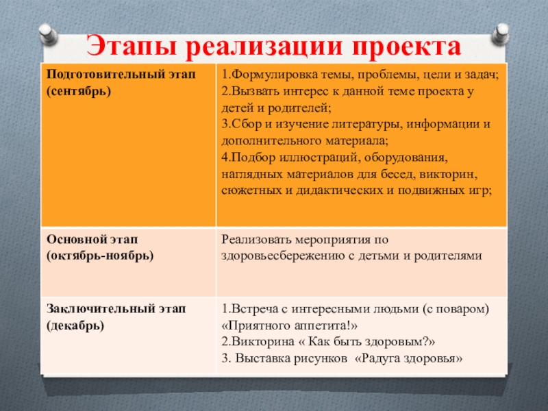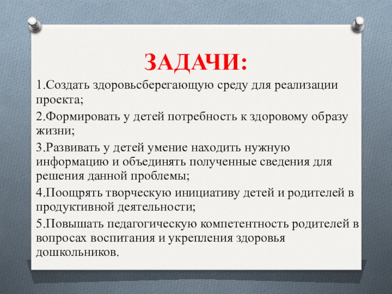 1.Создать здоровьсберегающую среду для реализации проекта;