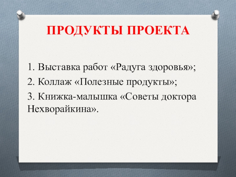 Слайд 28ПРОДУКТЫ ПРОЕКТА