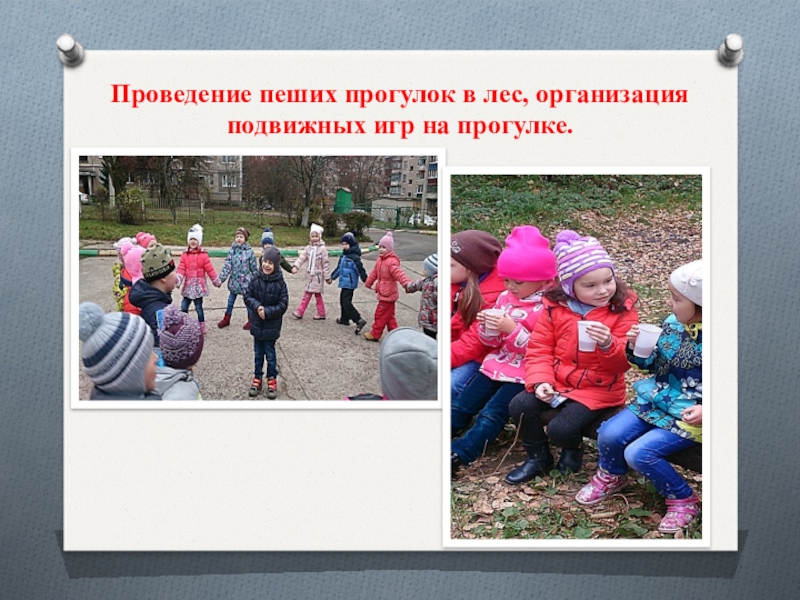 Слайд 23Проведение пеших прогулок в лес, организация подвижных игр на прогулке.
