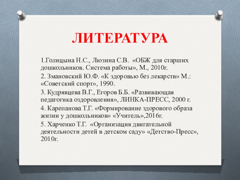 3. Кудрявцева В.Г., Егоров Б.Б. «Развивающая педагогика оздоровления», ЛИНКА-ПРЕСС, 2000 г.