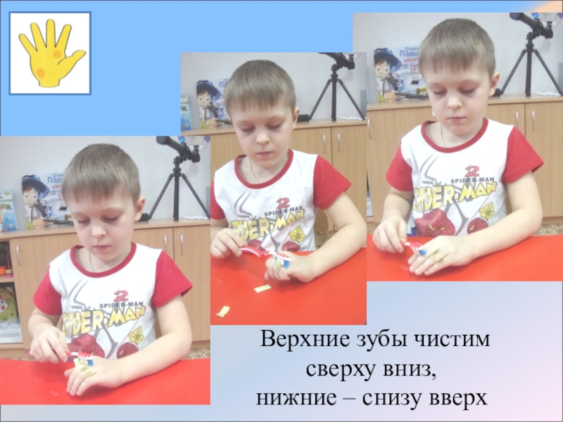 Верхние зубы чистим сверху вниз,