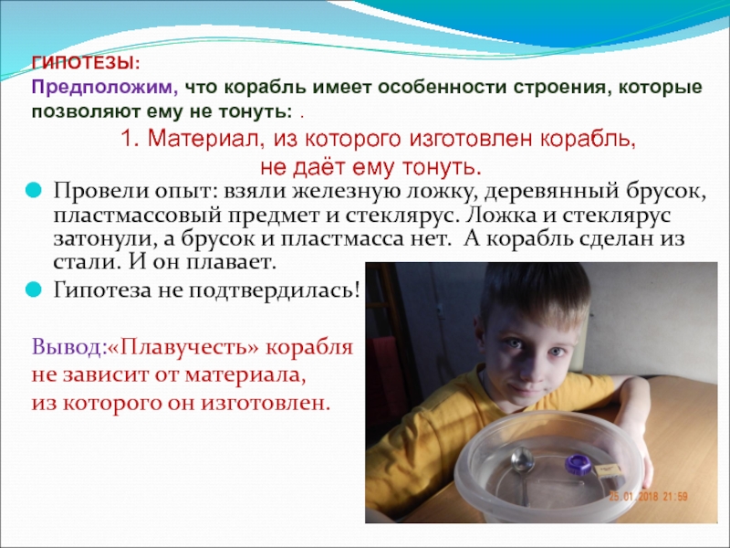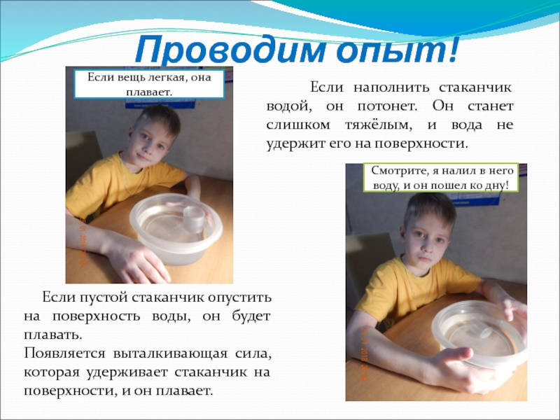 Эта сила толкает предмет вверх. И если она окажется больше веса предмета, например, корабля, то корабль будет держаться на поверхности и не потонет. Но если корабль будет перегружен или, получив пробоину, наполнится водой, он затонет – вес предмета станет больше веса выталкивающей силы.