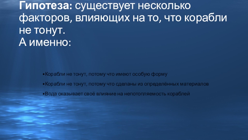 Слайд 4Гипотеза: существует несколько факторов, влияющих на то, что корабли не тонут.