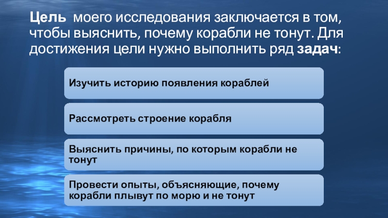 Слайд 3Цель моего исследования заключается в том, чтобы выяснить, почему корабли не