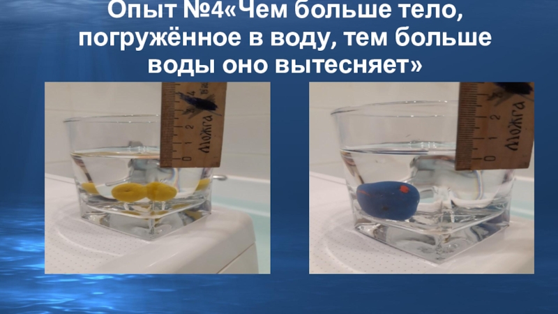 Слайд 13Опыт №4«Чем больше тело, погружённое в воду, тем больше воды оно