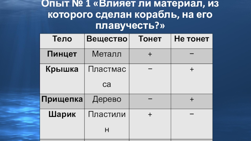 Слайд 10Опыт № 1 «Влияет ли материал, из которого сделан корабль, на