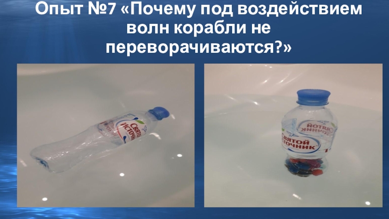 Слайд 17Опыт №7 «Почему под воздействием волн корабли не переворачиваются?»