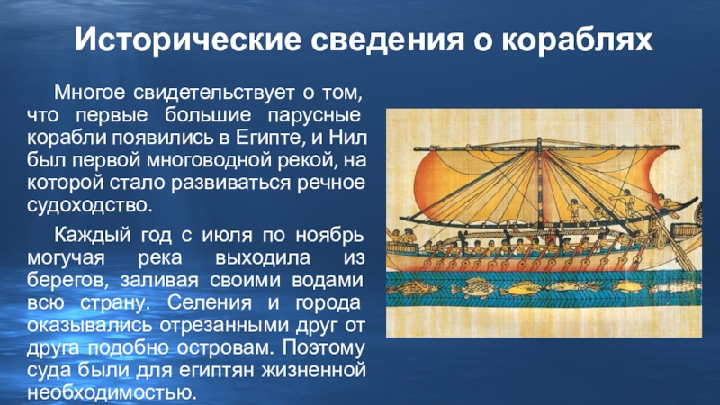 корабли появились в Египте, и Нил был первой многоводной рекой, на которой стало развиваться речное судоходство.