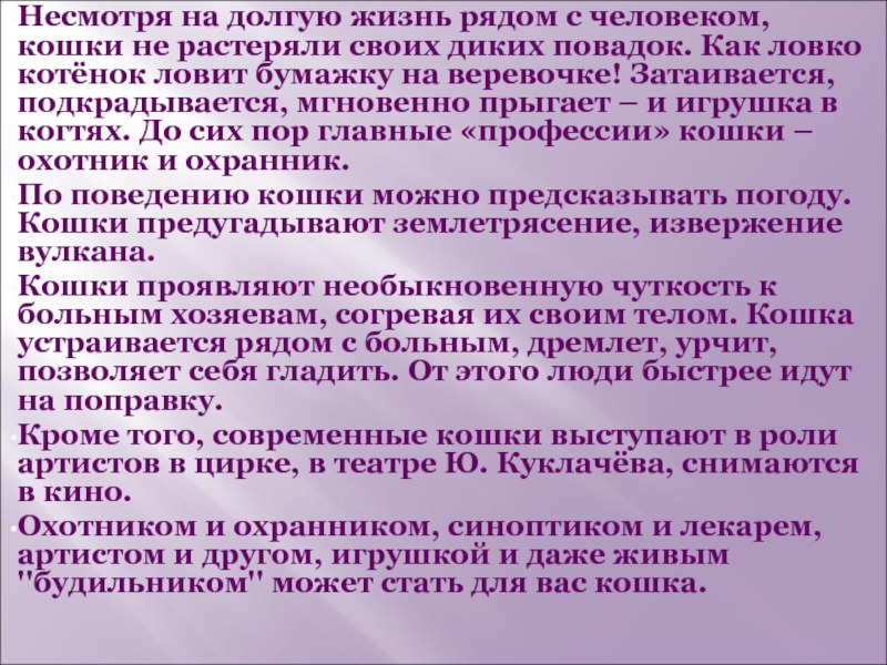 диких повадок. Как ловко котёнок ловит бумажку на веревочке! Затаивается, подкрадывается, мгновенно прыгает – и игрушка в когтях. До сих пор главные «профессии» кошки – охотник и охранник.