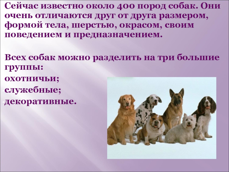Слайд 13Сейчас известно около 400 пород собак. Они очень отличаются друг от