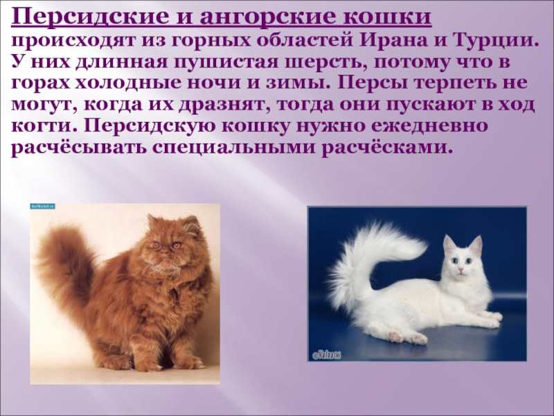 Слайд 4Персидские и ангорские кошки происходят из горных областей Ирана и Турции.
