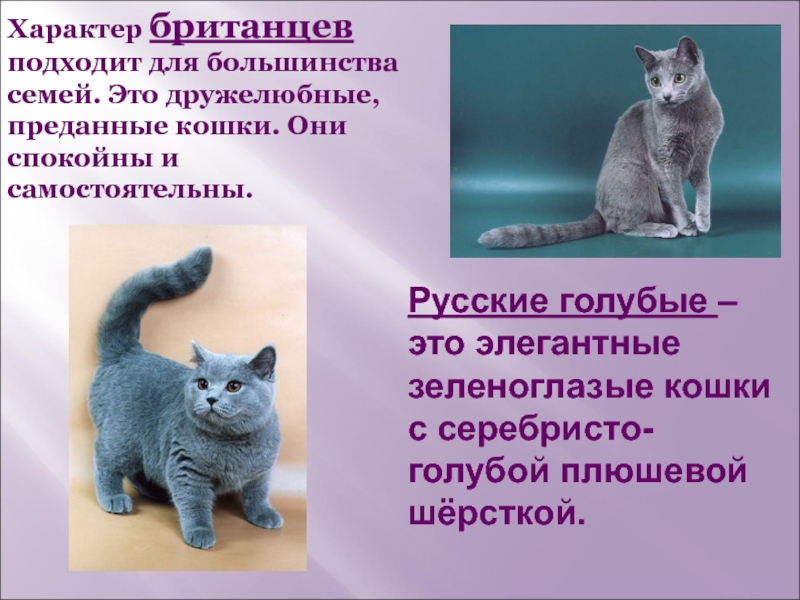 Слайд 6Русские голубые – это элегантные зеленоглазые кошки с серебристо-голубой плюшевой шёрсткой.