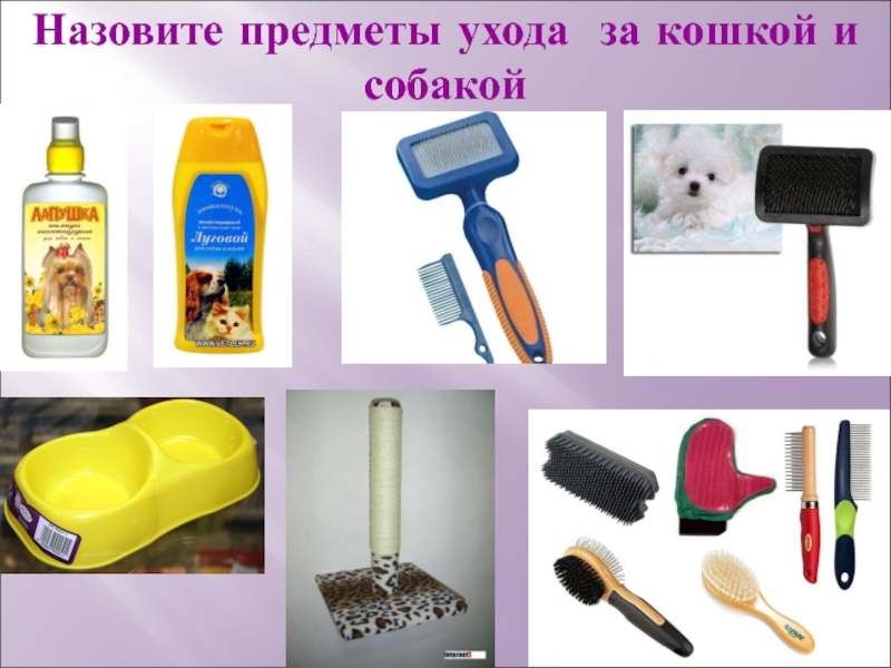 Слайд 20Назовите предметы ухода за кошкой и собакой
