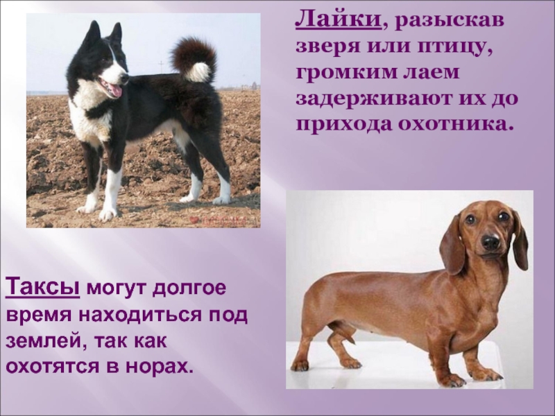 Слайд 14Лайки, разыскав зверя или птицу, громким лаем задерживают их до прихода