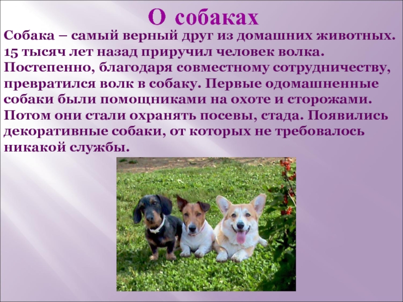 лет назад приручил человек волка. Постепенно, благодаря совместному сотрудничеству, превратился волк в собаку. Первые одомашненные собаки были помощниками на охоте и сторожами. Потом они стали охранять посевы, стада. Появились декоративные собаки, от которых не требовалось никакой службы.