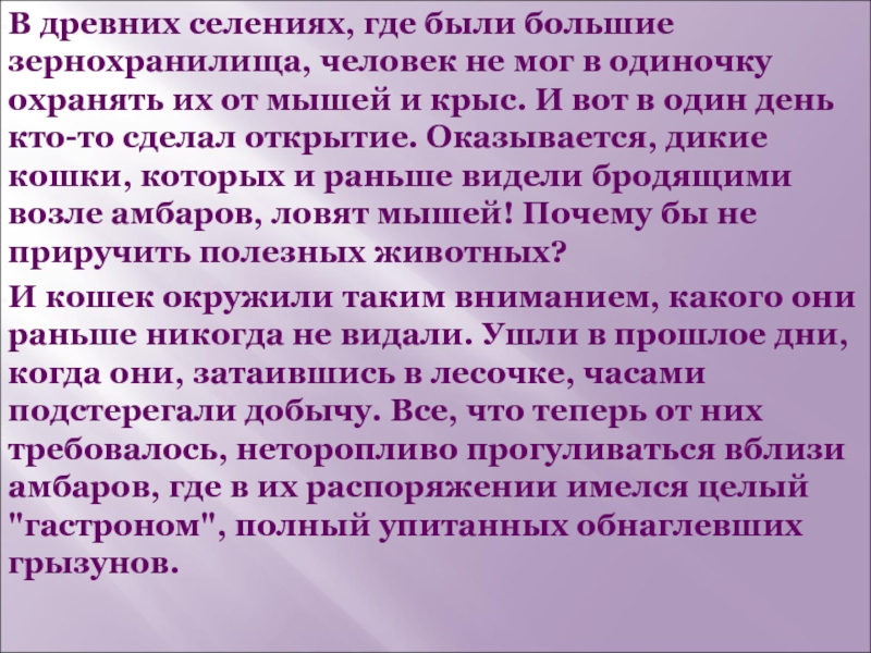 одиночку охранять их от мышей и крыс. И вот в один день кто-то сделал открытие. Оказывается, дикие кошки, которых и раньше видели бродящими возле амбаров, ловят мышей! Почему бы не приручить полезных животных?