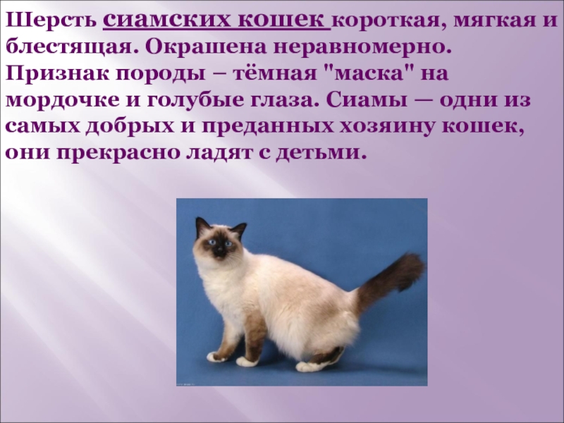 Слайд 8Шерсть сиамских кошек короткая, мягкая и блестящая. Окрашена неравномерно. Признак породы