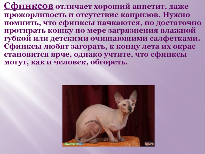 Слайд 7Сфинксов отличает хороший аппетит, даже прожорливость и отсутствие капризов. Нужно помнить,