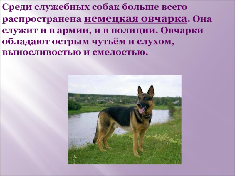 Слайд 15Среди служебных собак больше всего распространена немецкая овчарка. Она служит и