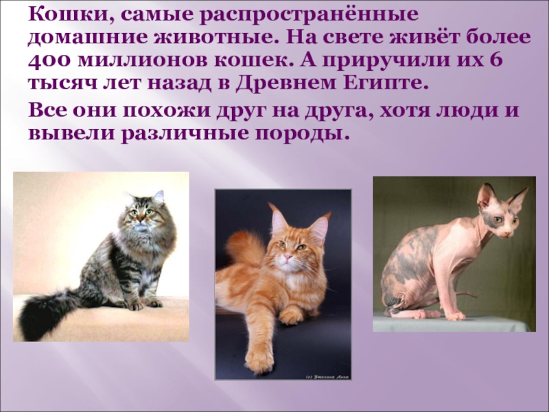 Слайд 2Кошки, самые распространённые домашние животные. На свете живёт более 400 миллионов