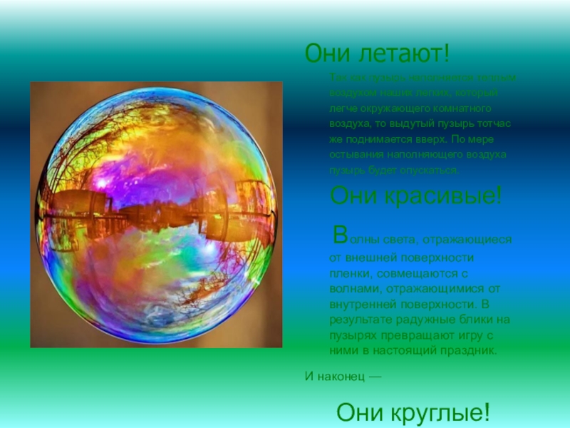 мыльной воды, которая формирует сферу (шар) с переливчатой поверхностью.
