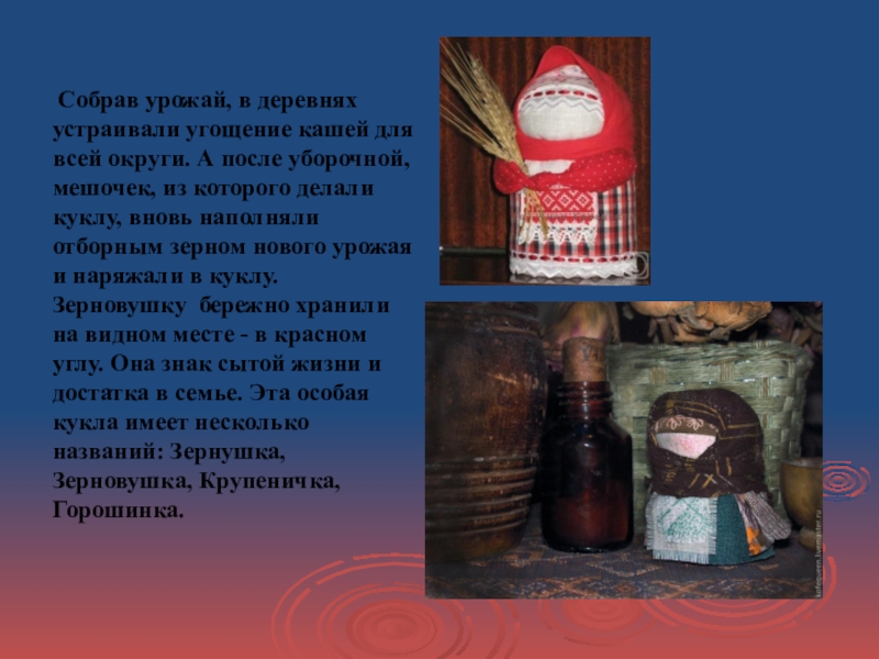 А после уборочной, мешочек, из которого делали куклу, вновь наполняли отборным зерном нового урожая и наряжали в куклу. Зерновушку бережно хранили на видном месте - в красном углу. Она знак сытой жизни и достатка в семье. Эта особая кукла имеет несколько названий: Зернушка, Зерновушка, Крупеничка, Горошинка.