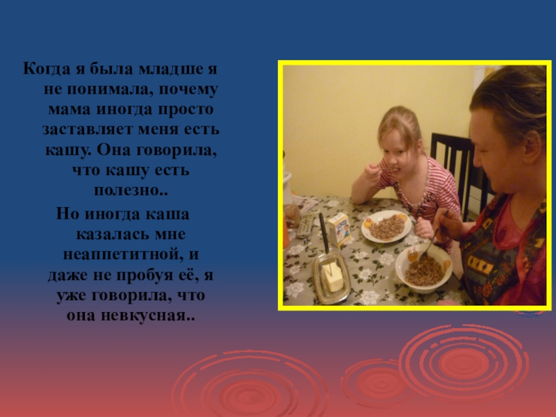 Но иногда каша казалась мне неаппетитной, и даже не пробуя её, я уже говорила, что она невкусная..