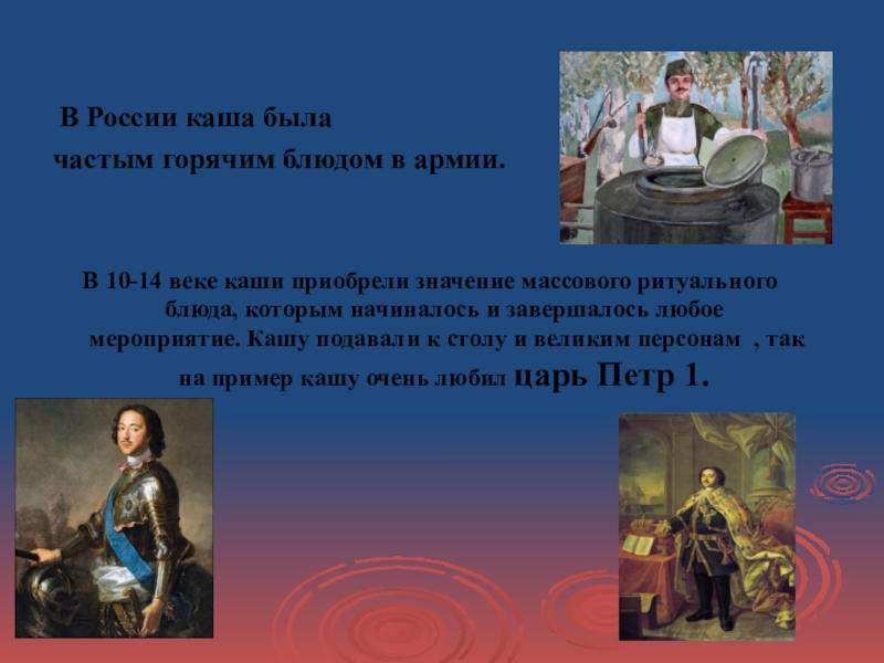 10-14 веке каши приобрели значение массового ритуального блюда, которым начиналось и завершалось любое мероприятие. Кашу подавали к столу и великим персонам , так на пример кашу очень любил царь Петр 1.