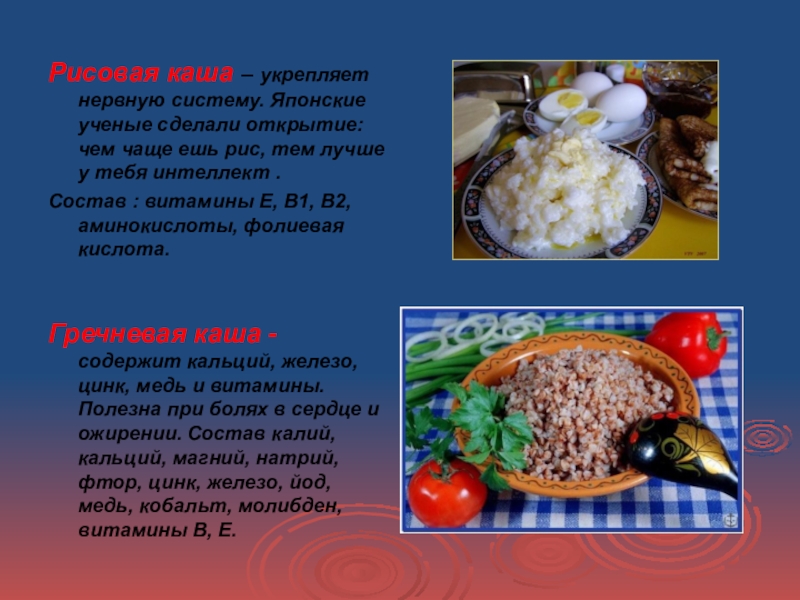 Гречневая каша - содержит кальций, железо, цинк, медь и витамины. Полезна при болях в сердце и ожирении. Состав калий, кальций, магний, натрий, фтор, цинк, железо, йод, медь, кобальт, молибден, витамины В, Е.