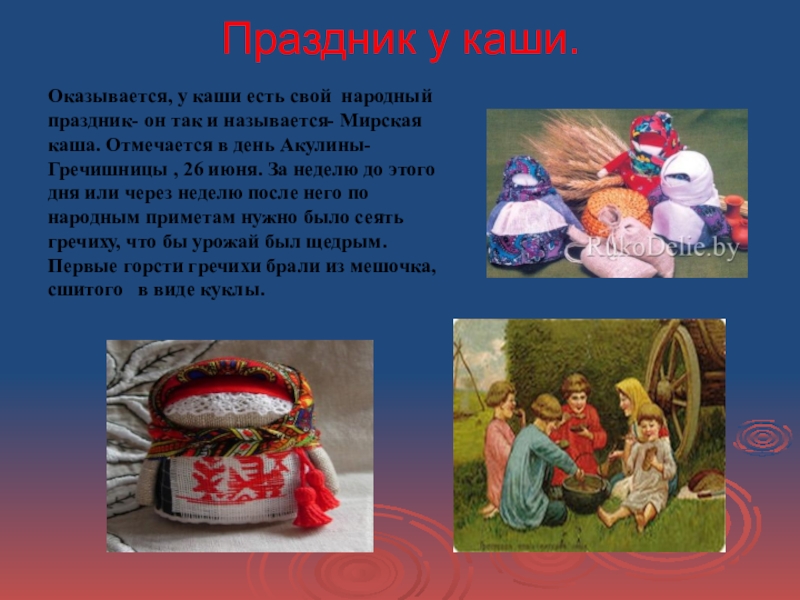 и называется- Мирская каша. Отмечается в день Акулины- Гречишницы , 26 июня. За неделю до этого дня или через неделю после него по народным приметам нужно было сеять гречиху, что бы урожай был щедрым. Первые горсти гречихи брали из мешочка, сшитого в виде куклы.