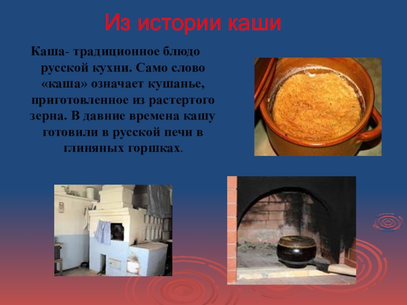 кухни. Само слово «каша» означает кушанье, приготовленное из растертого зерна. В давние времена кашу готовили в русской печи в глиняных горшках.