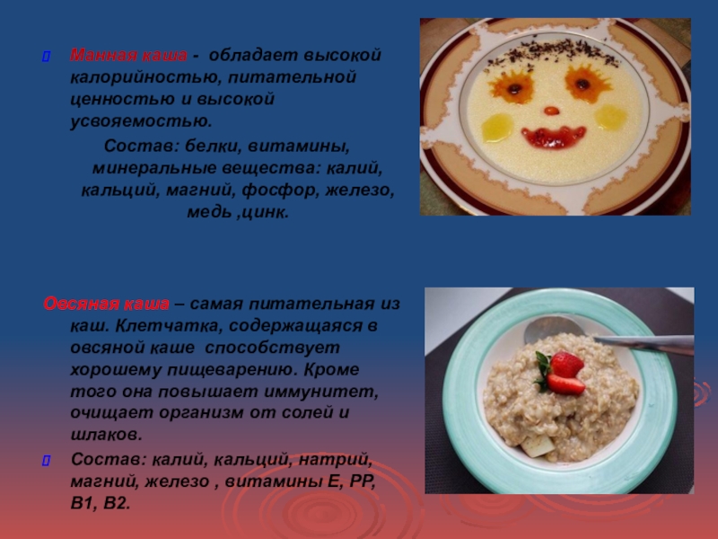 Манная каша - обладает высокой калорийностью, питательной ценностью и высокой усвояемостью.