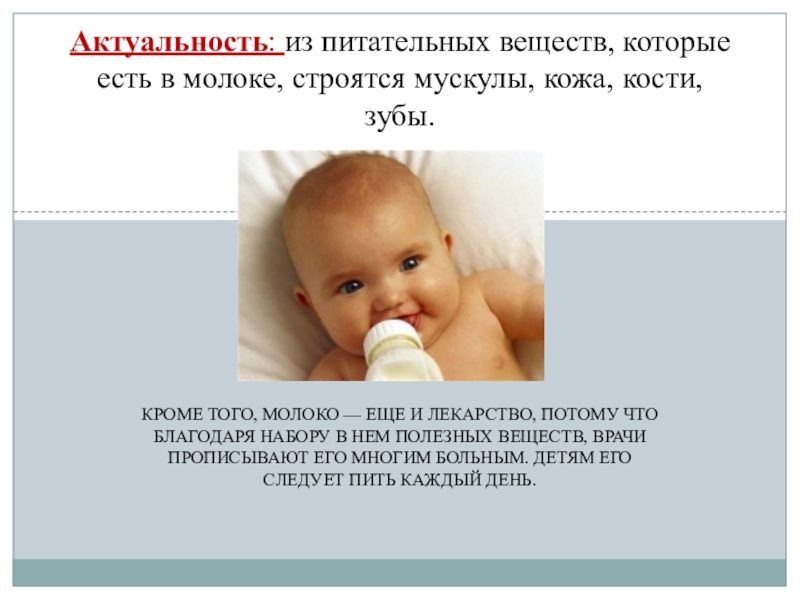 Актуальность: из питательных веществ, которые есть в молоке, строятся мускулы, кожа, кости, зубы.