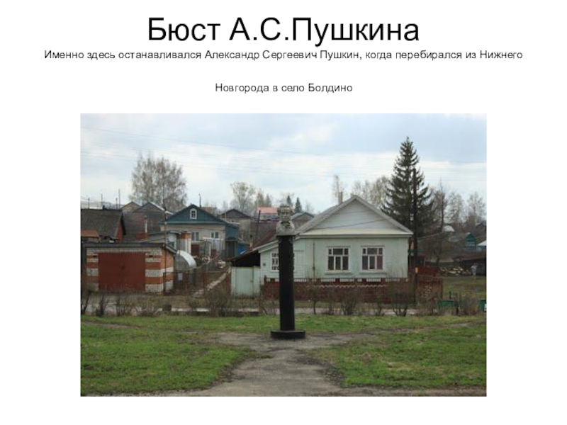 Слайд 5Бюст А.С.Пушкина Именно здесь останавливался Александр Сергеевич Пушкин, когда перебирался из Нижнего